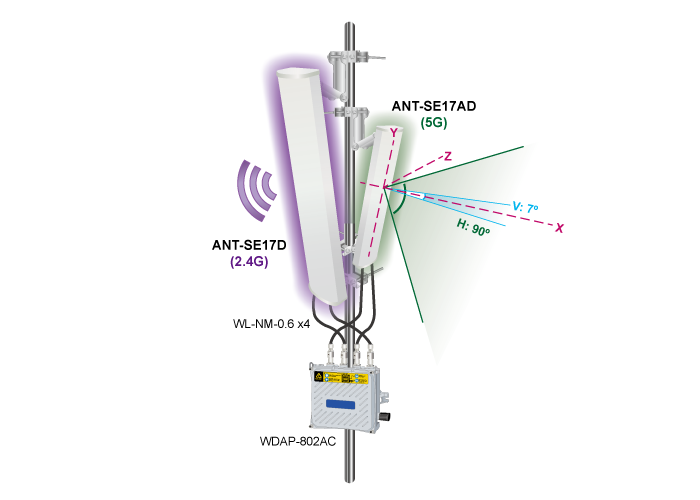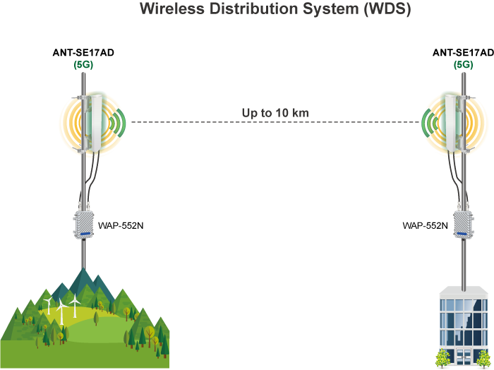 As the ANT-SE17AD can effectively enhance the performance and coverage of the 802.11ac 5GHz environment, it is also quite suitable for outdoor wireless LAN applications, such as point-to-point connection between the warehouses.