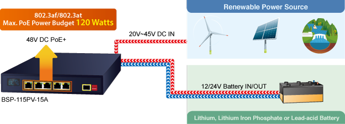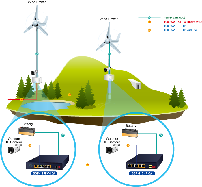 PLANET’s newly-launched Renewable Energy Industrial 802.3at PoE Ethernet Switch, the BSP-115PV-15A, can be charged by the inexhaustible and natural source of energy, such as solar, wind and hydroelectric power to conserve energy so as to economically power these remote IP cameras and wireless APs.
