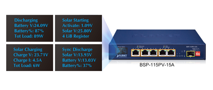 As the front panel of the BSP-115PV-15A provides an intuitive panel, you can check the current solar energy and battery statuses on the BSP-115PV-15A LCD screen. This easy operation can enhance the energy management efficiency of renewable PoE switches as the following special status functions are included: