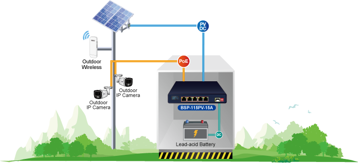 The 12V/24V lithium, lead-acid or lithium iron battery gets recharged by way of the BSP-115PV-15A where solar power is sourced. Thus, the BSP-115PV-15A will keep powering PD like wireless PoE AP without a cable and a wired camera connected to its port with a UTP cable. Its zero-carbon feature is made possible as the energy the unit gets is renewable. Most importantly, the operation of outdoor wireless IP-based surveillance can be continued into the night as the battery is charged during the day.