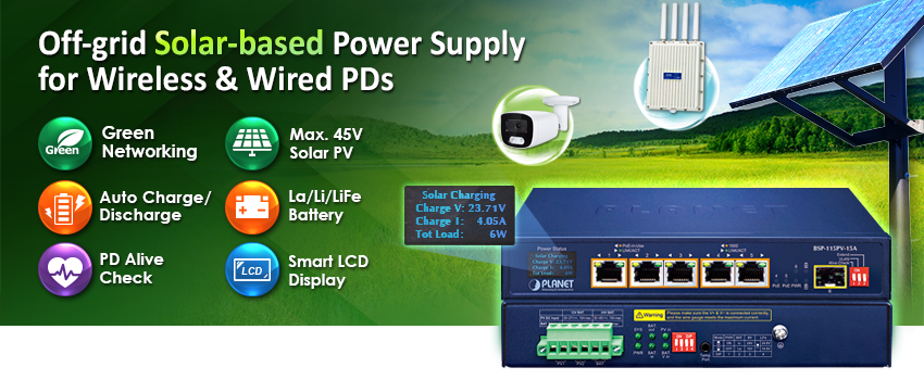 • product_editor_4418_tab_content: <strong>Off-grid Solar-based Power Supply for Wireless & Wired PDs</strong> During the day, solar energy can power the communication system and charge the battery, and at night, the battery uses the excess electricity generated by solar energy during the day to power the communication system, which builds a zero-carbon, green and stable communication system without any external energy.   <img style="display: block; margin-left: auto; margin-right: auto;" src="https://www.planet.com.sa/planet-storage/2025/01/BSP-115PV-15A_5.png" alt="" width="700" height="319" /> <strong>Extension of Network Deployment with Gigabit Fiber port</strong> With the 802.3at PoE+ injector and 1000BASE-X SFP fiber ports, the BSP-115PV-15A supplies power to other devices, such as IP cameras where high-speed and stable data transmission can be made to a remote core network. It can extend the distance to a maximum of 120 kilometers between the BSP-115PV-15A and control center via fiber-optic link.   <img style="display: block; margin-left: auto; margin-right: auto;" src="https://www.planet.com.sa/planet-storage/2025/01/BSP-115PV-15A_6.png" alt="" width="700" height="647" />