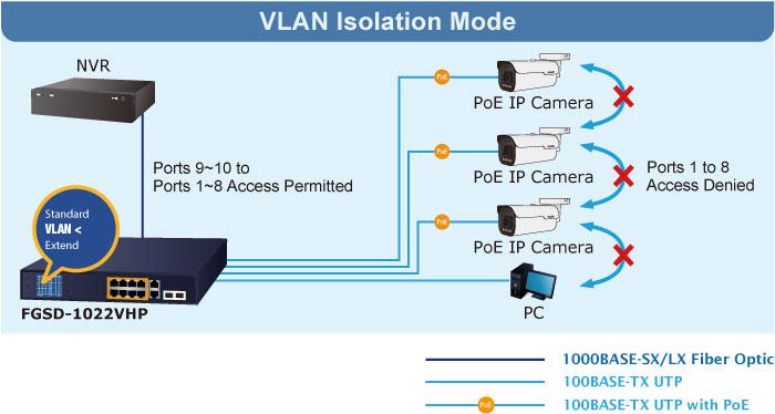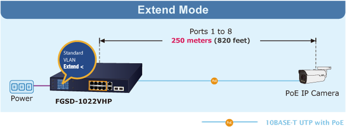 In the Extend operation mode, the FGSD-1022VHP operates on a per-port basis at 10Mbps duplex operation but can support 20-watt PoE power output over a distance of up to 250 meters overcoming the 100m limit on Ethernet UTP cable. With this brand-new feature, the FGSD-1022VHP provides an additional solution for 802.3at/af PoE distance extension, thus saving the cost of Ethernet cable installation. Its VLAN isolation function isolates ports so as to prevent broadcast storm and defend DHCP spoofing in the Extend operation mode.