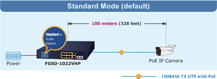 PLANET FGSD-1022VHP provides Standard, VLAN and Extend operation modes. The FGSD-1022VHP operates as a normal IEEE 802.3af/at PoE Switch in the Standard operation mode. The VLAN operation mode features the port-based VLAN function that can help to prevent the IP camera’s multicast or broadcast storm from influencing each other.