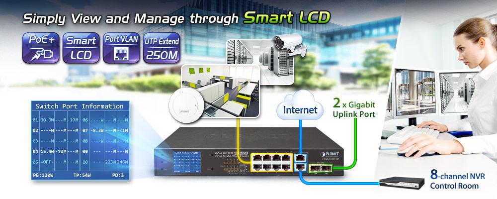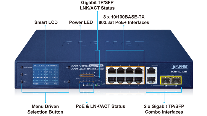 PLANET FGSD-1022VHP is an ideal Plug and Watch Power over Ethernet solution which provides quick installation, real-time PoE work status monitoring and immediate troubleshooting through its unique LCD display to improve work efficiency and quality without any PC or software required.