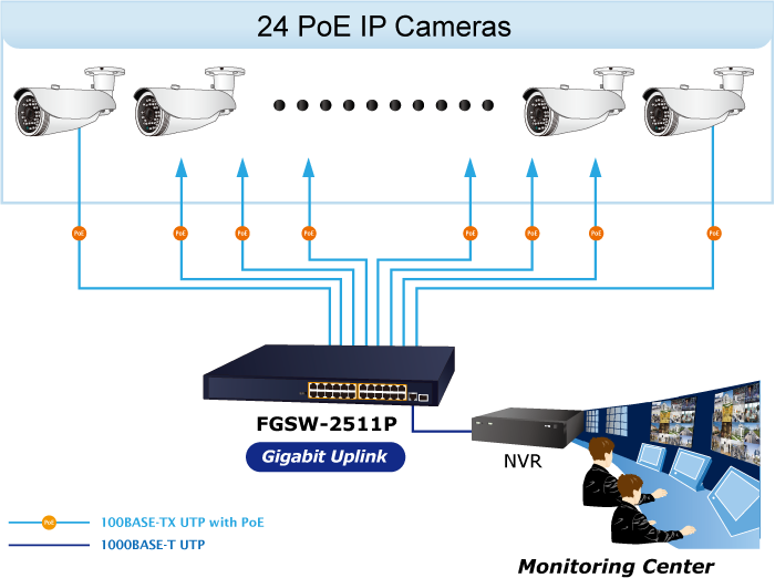 The FGSW-2511P comes with one combo uplink interface with a transfer rate of 1000Mbps to ensure high-speed data and video transmission, and reliable assurance for connection between the surveillance system and outside network where the eight PoE+ ports can be used to their full potential.