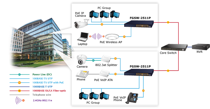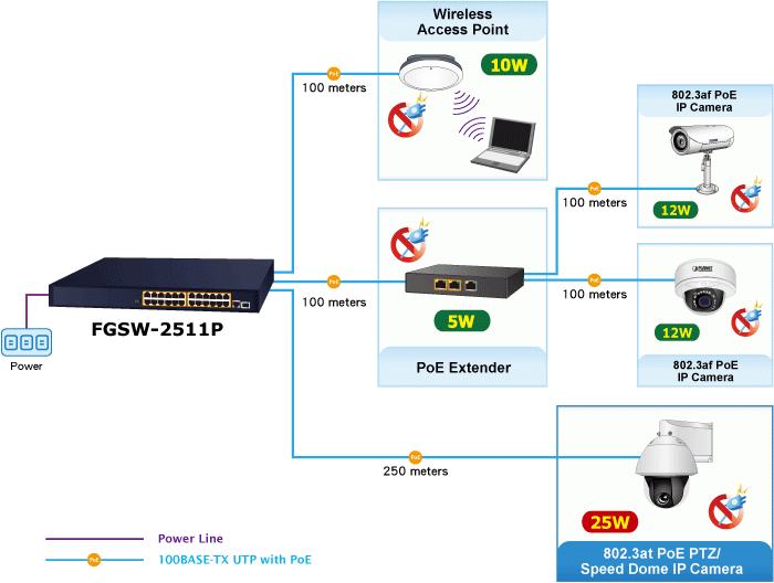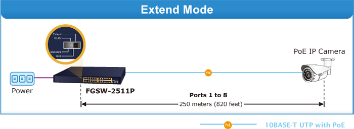 - In the “Extend” operation mode, PoE Port-1 to Port-8 of the FGSW-2511P can support 25-watt PoE power output over a distance of up to 250 meters overcoming the 100m limit on Ethernet UTP cable.