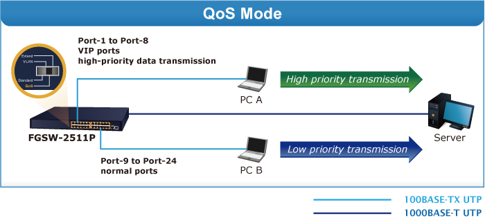 - The “QoS” operation mode features port-based QoS function. Port 1 to Port 8 supports port priority; optimize port cache.