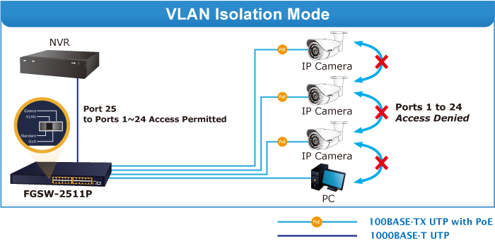 With this brand-new feature, the FGSW-2511P provides an additional solution for 802.3af/at PoE distance extension, thus saving the cost of Ethernet cable installation. Its VLAN isolation function isolates each port so as to prevent broadcast storm and defend DHCP spoofing in the “VLAN” operation mode.