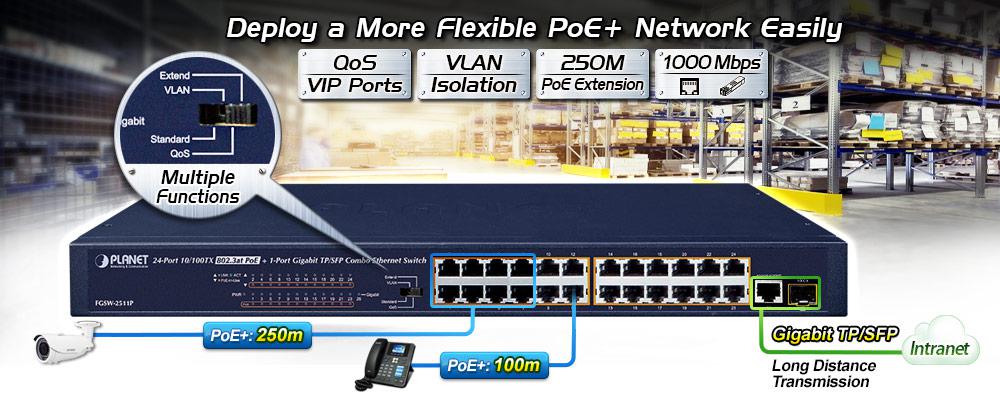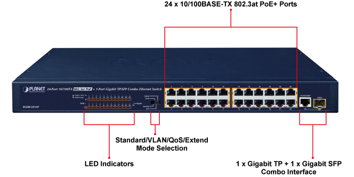 The FGSW-2511P is a new PLANET 802.3at PoE Fast Ethernet Switch, provides 24 10/100BASE-TX 802.3at PoE+ ports with a total of 190 watts of PoE budget, one 10/100/1000BASE-T uplink port, and one shared 1000BASE-X SFP slot. Its PoE power is more than enough for those network applications with Fast Ethernet speed transmission.