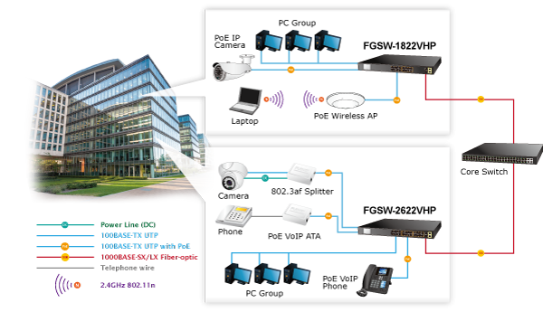 As data and power are transmitted over one cable, the FGSW-2622VHP does not need a second cable and electrical outlets on the wall, ceiling or any unreachable place. Thus, it helps to lower the installation costs and simplify the installation effort. All the RJ45 copper interfaces of the FGSW-2622VHP support 10/100/1000Mbps auto-negotiation for optimal speed detection through RJ45 Category 6, 5 or 5e cable. It also supports standard auto-MDI/MDI-X that can detect the type of connection to any Ethernet device without requiring special straight-through or crossover cables.