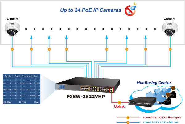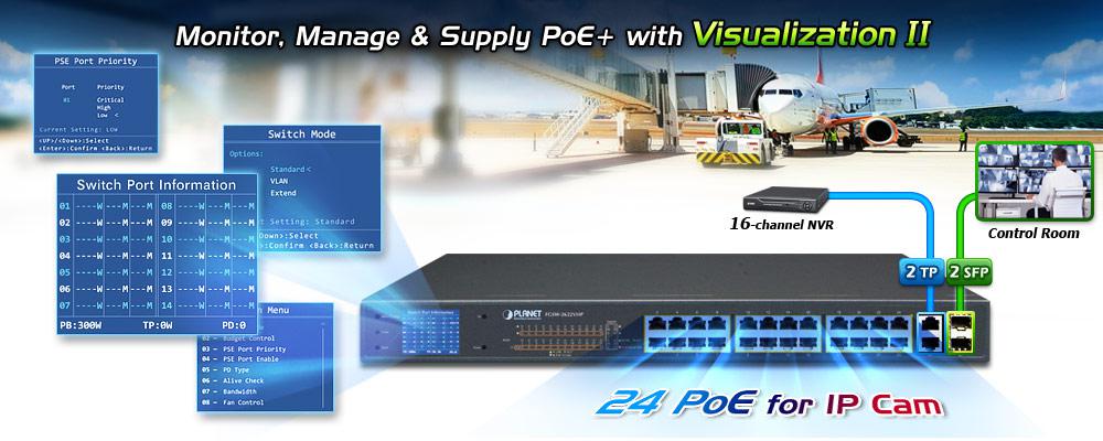 PLANET FGSW-2622VHP is an ideal Plug and Watch Power over Ethernet solution which provides quick installation, real-time PoE work status monitoring and immediate troubleshooting through its unique LCD display to improve work efficiency and quality without any PC or software required.