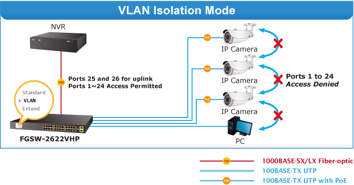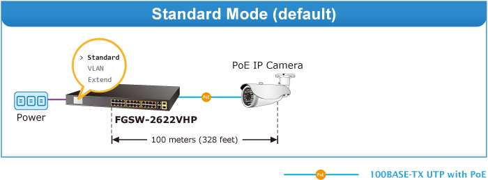 PLANET FGSW-2622VHP provides Standard, VLAN and Extend operation modes. The FGSW-2622VHP operates as a normal IEEE 802.3af/at PoE Switch in the Standard operation mode. The VLAN operation mode features the port-based VLAN function that can help to prevent the IP camera’s multicast or broadcast storm from influencing each other.