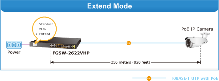 In the Extend operation mode, the FGSW-2622VHP operates on a per-port basis at 10Mbps duplex operation but can support 20-watt PoE power output over a distance of up to 250 meters overcoming the 100m limit on Ethernet UTP cable. With this brand-new feature, the FGSW-2622VHP provides an additional solution for 802.3af/at PoE distance extension, thus saving the cost of Ethernet cable installation. Its VLAN isolation function isolates ports so as to prevent broadcast storm and defend DHCP spoofing in the Extend operation mode.