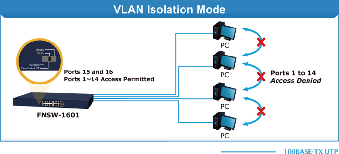 In the “Extend” operation mode, the FNSW-1601 operates on a per-port basis at 10Mbps duplex operation but can transmit data over a distance of up to 200 meters overcoming the 100m limit on Ethernet UTP cable. With this brand-new feature, the FNSW-1601 provides an additional solution for distance extension, thus saving the cost of Ethernet cable installation. Its VLAN isolation function isolates each port so as to prevent broadcast storm and defend DHCP spoofing in the “Extend” operation mode.