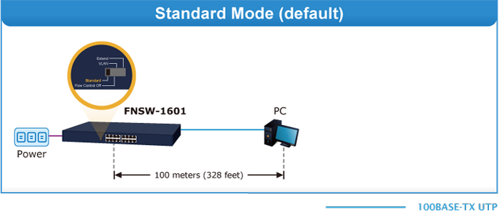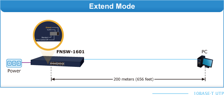 | Extend | This mode makes the FNSW-1601 operate as a distance extension switch and port 1 to port 8 can only transmit distance of 200m at speed of 10Mbps. |