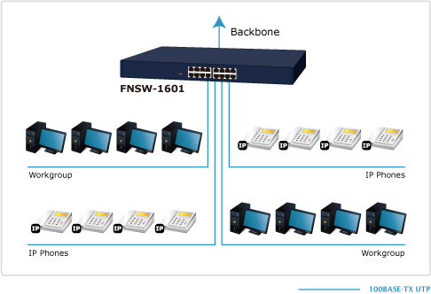 The high performance throughput (filtering / forwarding rate: 14,880 packets per second at 10Mbps, 148,800pps and 100Mbps) helps the FNSW-1601 boost bandwidth, eliminates unnecessary traffic, and relieves congestion on your critical server path. The FNSW-1601 is the ideal choice to alleviate bottlenecks in client / server and peer-to-peer environments in a cost-effective way.