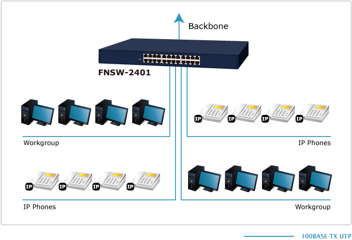 The high performance throughput (filtering/forwarding rate: 14,880 packets per second in 10Mbps, 148,800pps in 100Mbps) helps the FNSW-2401 boost bandwidth, eliminates unnecessary traffic, and relieves congestion on your critical server path. The FNSW-2401 is the ideal choice to alleviate bottlenecks in client / server and peer-to-peer environments in a cost effective way.