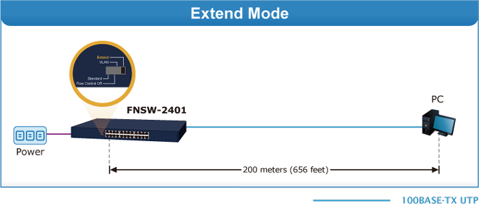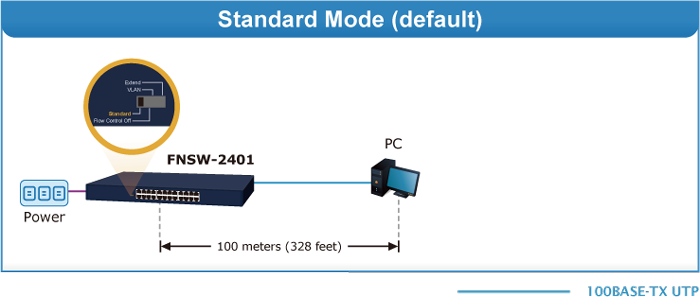 The new FNSW-2401 offers “Standard”, “Flow Control Off”, “VLAN” or “Extend” mode. The FNSW-2401 operates as a normal Fast Ethernet Switch in the “Standard” operation mode.