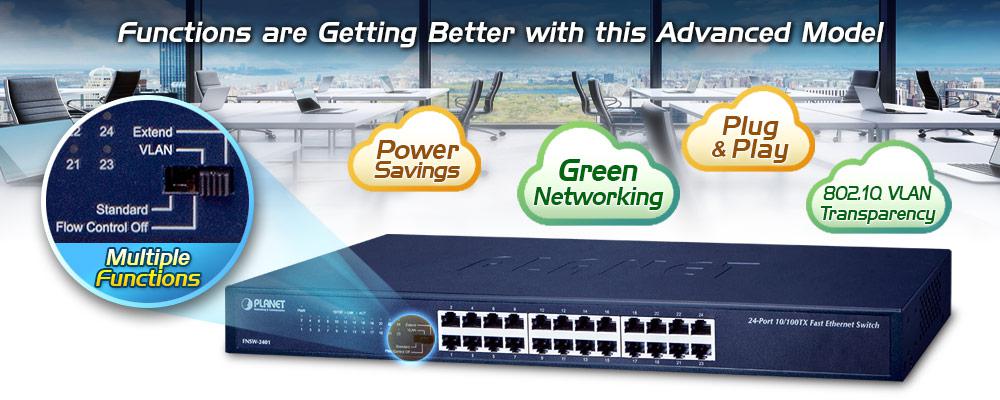 PLANET FNSW-2401 Green Networking Switch is an ideal solution in line with the energy-saving trend worldwide. The FNSW-2401 is a 24-port 10/100BASE-TX Fast Ethernet Switch upgraded from the earlier version, thus giving you the benefits of energy savings and high performance.