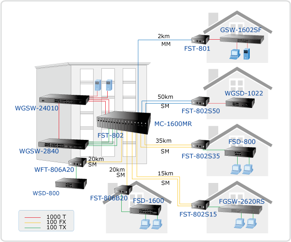 PLANET FST-80x Smart Media Converter series provides media conversion between 10/100BASE-TX and 100BASE-FX interfaces, such as multi-mode ST/SC connectors (2km), single-mode SC connector (15/35/50km) and single fiber connector using the wavelength-division multiplexing (WDM) technology (20/60km) to enable to extend links over long distances using fiber optic cable.
