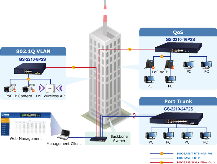 The two mini-GBIC slots built in the GS-2210-24P2S support SFP auto-detection and dual speed as it features 100BASE-FX and 1000BASE-SX/LX SFP (Small Form-factor Pluggable) fiber transceivers to uplink to backbone switch and monitoring center in long distance. The distance can be extended from 550 meters to 2 kilometers (multi-mode fiber) and up to above 10/20/30/40/50/70/120 kilometers (single-mode fiber or WDM fiber). They are well suited for applications within the enterprise data centers and distributions.