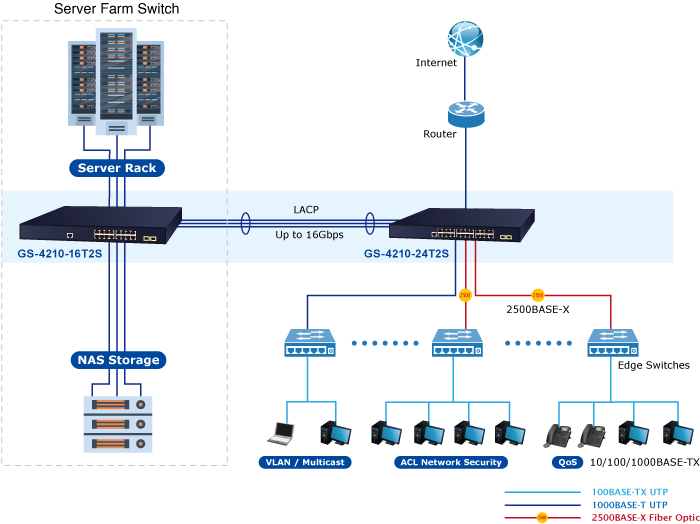 • product_editor_4418_tab_content: <strong>Department/Edge Security and QoS Switch</strong> The GS-4210-16T2S connects up to 16 high speed workstations in the Ethernet environment, in which its two SFP mini-GBIC interfaces provide an uplink to a department backbone. Moreover, the Switch provides 36Gbps switch fabric and high bandwidth for backbone connection. The GS-4210-16T2S improves the network efficiency and safeguards the network clients with its powerful features: <ul> <li> IPv6/IPv4 management</li> <li> Layer 2 to Layer 4 security</li> <li> QoS</li> <li> 802.1x port-based and MAC-based network access authentication security</li> <li> Multicast IGMP snooping</li> </ul> The advanced functionality of the GS-4210-16T2S eliminates traditional issues associated with the use of Ethernet. Users can be separated with advanced VLAN functionality to enhance security. It makes the GS-4210-16T2S one of the best and most cost-effective switch solutions for SMBs.   <p style="text-align: center;"><img src="https://www.planet.com.sa/planet-storage/2025/01/GS-4210-24T2Sv2.1-3.png" alt="" width="700" height="393" /></p>   <span style="color: #000000;"><strong>High-performance Backbone/Server Farm Switch</strong></span> Gigabit Ethernet supported equipment has become the fundamental unit of enterprises and network servers. With up to 36 Gbps non-blocking switch fabric, the GS-4210-16T2S can easily provide a local high bandwidth Gigabit Ethernet network for backbone of enterprises or telecoms. With its port trunking function, a 16 GB fat pipe is provided to connect to the backbone if required. It is ideal to be used as a server farm switch connecting to servers. The GS-4210-16T2S can offer the uplink to the edge network through Gigabit Ethernet LX/SX SFP modules with the two SFP ports.   <p style="text-align: center;"><img src="https://www.planet.com.sa/planet-storage/2025/01/GS-4210-24T2Sv2.1-4.png" alt="" width="700" height="523" /></p>   <span style="color: #000000;"><strong>FTTX/MAN Application</strong></span> The GS-4210-16T2S applies the <strong>double tag VLAN (Q-in-Q)</strong> technology to providing low cost and easy operation for service providers carrying traffic for multiple customers across their networks. It features SNMP v3 and RMON Groups. The SNMP v3 security structure consists of security models, with each model having its own security levels. With two dual-speed SFP slots built in, the deployment distance of the GS-4210-16T2S can be extended up to 120 kilometers (single-mode fiber), which provides a high-performance edge service for FTTx solutions.   To build a network solution of FTTH (Fiber to the Home) or FTTC (Fiber to the Curb) for ISPs, and FTTB (Fiber to the Building) for enterprises, the various distances of SFP and Bidi (WDM) transceivers are optional for customers’ choices. For security and various applications, the 16 Gigabit ports of the GS-4210-16T2S can be configured with VLAN settings and connected to different units, offices, floors, houses and departments.   <p style="text-align: center;"><img src="https://www.planet.com.sa/planet-storage/2025/01/GS-4210-24T2Sv2.1-7.png" alt="" width="700" height="484" /></p>
