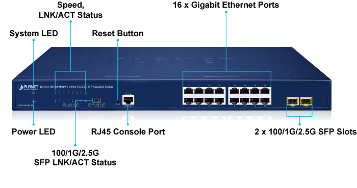 • product_editor_4421_tab_content: <strong>Physical Port</strong> <ul> <li><strong>16-port 10/100/1000BASE-T</strong> Gigabit RJ45 copper</li> <li><strong>2 100/1000BASE-X</strong> mini-GBIC/SFP slots</li> <li>RJ45 console interface for switch basic management and setup</li> <li>Reset button for system factory default</li> </ul>   <strong>Switching</strong> <ul> <li>Hardware based 10/100Mbps, half/full duplex and 1000Mbps full duplex mode, flow control and auto-negotiation and auto MDI/MDI-X</li> <li>Features Store-and-Forward mode with wire-speed filtering and forwarding rates</li> <li>IEEE 802.3x flow control for full duplex operation and back pressure for half duplex operation</li> <li>9K jumbo frame</li> <li>Automatic address learning and address aging</li> <li>Supports CSMA/CD protocol</li> </ul>   <strong>Layer 2 Features</strong> <ul> <li>Supports <strong>VLAN</strong> <ul> <li>IEEE 802.1Q tagged VLAN</li> <li>Provider Bridging (VLAN Q-in-Q) support (IEEE 802.1ad)</li> <li>Protocol VLAN</li> <li>Voice VLAN</li> <li>Private VLAN (Protected port)</li> <li>Management VLAN</li> <li>GVRP</li> </ul> </li> <li>Supports <strong>Spanning Tree Protocol</strong> <ul> <li>STP (Spanning Tree Protocol)</li> <li>RSTP (Rapid Spanning Tree Protocol)</li> <li>MSTP (Multiple Spanning Tree Protocol)</li> <li>STP BPDU Guard, BPDU Filtering and BPDU Forwarding</li> </ul> </li> <li>Supports<strong> Link Aggregation</strong> <ul> <li>IEEE 802.3ad Link Aggregation Control Protocol (LACP)</li> <li>Cisco ether-channel (static trunk)</li> <li>Maximum 8 trunk groups, up to 8 ports per trunk group</li> </ul> </li> <li>Provides port mirror (many-to-1)</li> <li>Loop protection to avoid broadcast loops</li> <li>Supports ERPS (Ethernet Ring Protection Switching)</li> </ul>   <strong>Quality of Service</strong> <ul> <li>Ingress/Egress Rate Limit per port bandwidth control</li> <li>Storm Control support <ul> <li>Broadcast/unknown unicast/unknown multicast</li> </ul> </li> <li>Traffic classification <ul> <li>IEEE 802.1p CoS</li> <li>TOS/DSCP/IP precedence of IPv4/IPv6 packets</li> </ul> </li> <li>Strict priority and Weighted Round Robin (WRR) CoS policies</li> </ul>   <strong>Multicast</strong> <ul> <li>Supports IPv4 IGMP snooping v2 and v3</li> <li>Supports IPv6 MLD snooping v1, v2</li> <li>IGMP querier mode support</li> <li>IGMP snooping port filtering</li> <li>MLD snooping port filtering</li> </ul>   <strong>Security</strong> <ul> <li>Authentication <ul> <li>IEEE 802.1X port-based network access authentication</li> <li>Built-in RADIUS client to cooperate with the RADIUS servers</li> <li>DHCP Option 82</li> <li>RADIUS/TACACS+ login user access authentication</li> </ul> </li> <li>Access Control List <ul> <li>IPv4/IPv6 IP-based ACL</li> <li>IPv4/IPv6 IP-based ACE</li> <li>MAC-based ACL</li> <li>MAC-based ACE</li> </ul> </li> <li>MAC Security <ul> <li>Static MAC</li> <li>MAC Filtering</li> </ul> </li> <li>Port security for source MAC address entries filtering</li> <li>DHCP snooping to filter distrusted DHCP messages</li> <li>Dynamic ARP Inspection discards ARP packets with invalid MAC address to IP address binding</li> <li>IP source guard prevents IP spoofing attacks</li> <li>DoS attack prevention</li> </ul>   <strong>Management</strong> <ul> <li>IPv4 and IPv6 dual stack management</li> <li>Switch management interface <ul> <li>Web switch management</li> <li>Console/Telnet Command Line Interface</li> <li>SNMP v1 and v2c switch management</li> <li>SSHv2, TLSv1.2 and SNMP v3 secure access</li> </ul> </li> <li>User privilege levels control</li> <li>Built-in Trivial File Transfer Protocol (TFTP) client</li> <li>BOOTP and DHCP for IP address assignment</li> <li>System maintenance <ul> <li>Firmware upload/download via HTTP/TFTP</li> <li>Configuration upload/download through web interface</li> <li>Dual images</li> <li>Hardware reset button for system reboot or reset to factory default</li> </ul> </li> <li>SNTP Network Time Protocol</li> <li>Cable diagnostics</li> <li>Link Layer Discovery Protocol (LLDP) and LLDP-MED</li> <li>SNMP trap for interface link up and link down notification</li> <li>Event message logging to remote Syslog server</li> <li>Four RMON groups (history, statistics, alarms and events)</li> <li>PLANET Smart Discovery Utility for deployment management</li> <li>PLANET NMS system and CloudViewer for deployment management</li> </ul>