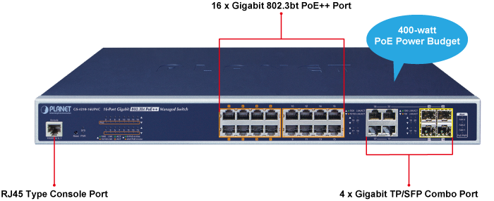 PLANET GS-4210-16UP4C is a cost-optimized, Gigabit 802.3bt PoE++ Managed Switch featuring PLANET intelligent PoE functions to improve the availability of critical business applications. It provides IPv6/IPv4 dual stack management and built-in L2/L4 Gigabit switching engine along with 16 10/100/1000BASE-T ports featuring 95-watt 802.3bt type-4 PoE++ injector ports and 4 additional Gigabit TP/SFP combo ports. With a total power budget of up to 400 watts for different kinds of PoE applications, the GS-4210-16UP4C provides a quick, safe and cost-effective 802.3bt PoE++ network solution for small businesses and enterprises.