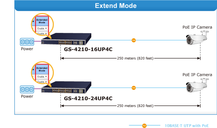 In the “Extend” operation mode, the GS-4210-16UP4C operates on a per-port basis at 10Mbps duplex operation but can support 50-watt PoE power output over a distance of up to 250 meters overcoming the 100m limit on Ethernet UTP cable. With this brand-new feature, the GS-4210-16UP4C provides an additional solution for 802.3at/af PoE distance extension, thus saving the cost of Ethernet cable installation.