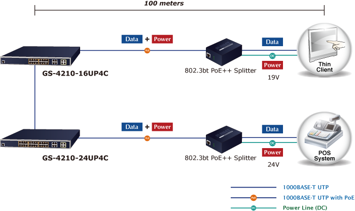Gigabit 802.3bt PoE++ and PoE+ Network Deployment Solution PLANET GS-4210-16UP4C can easily build an 802.3BT PoE++ networking solution on the cyber security system for the enterprises. For instance, it can work with the POS system and thin client to perform comprehensive security protection for today’s businesses. The GS-4210-16UP4C and 802.3bt PoE++ Splitter-POE-173S, operate as a pair to provide the easiest way to power your Ethernet devices which need high power input. Receiving data and power from the GS-4210-16UP4C, the POE-173S separates digital data and power into three optional outputs (12V, 19V or 24V DC) to non-PoE devices such as laptops, Thin Client, POS System, PTZ (pan, tilt & zoom) network cameras, PTZ speed dome, color touch-screen IP phones, multi-channel wireless LAN access points and other network devices at distance up to 100 meters.