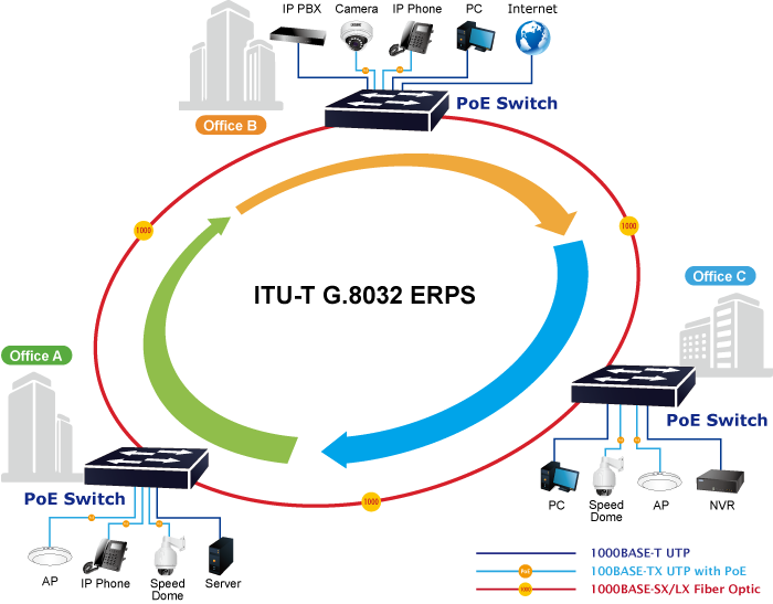 The GS-4210-24P2S supports redundant ring technology and features strong, rapid self-recovery capability to prevent interruptions and external intrusions. It incorporates advanced ITU-T G.8032 ERPS (Ethernet Ring Protection Switching) technology, Spanning Tree Protocol (802.1s MSTP) into customer’s network to enhance system reliability and uptime in various environments.