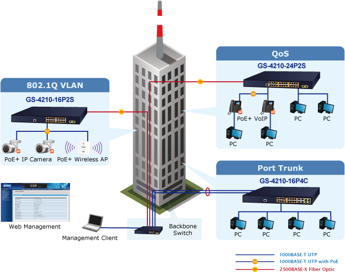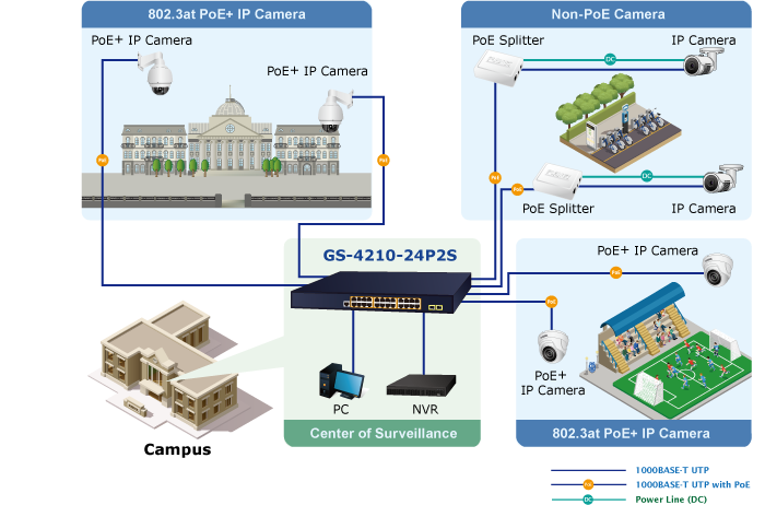 As the PoE managed switch for surveillance, wireless and VoIP networks, the GS-4210-24P2S features special PoE management functions: