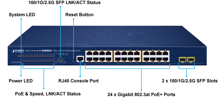 PLANET GS-4210-24P2S is an ideal IEEE 802.3at Power over Ethernet Plus (PoE+) Gigabit Switch which provides cost-effective advantage to local area network and is widely accepted in the SMB office network. It offers intelligent Layer 2 data packet switching and management functions, friendly web user interface and stable operation, also the popular IPv6/IPv4 management and abundant L2/L4 switching functions.