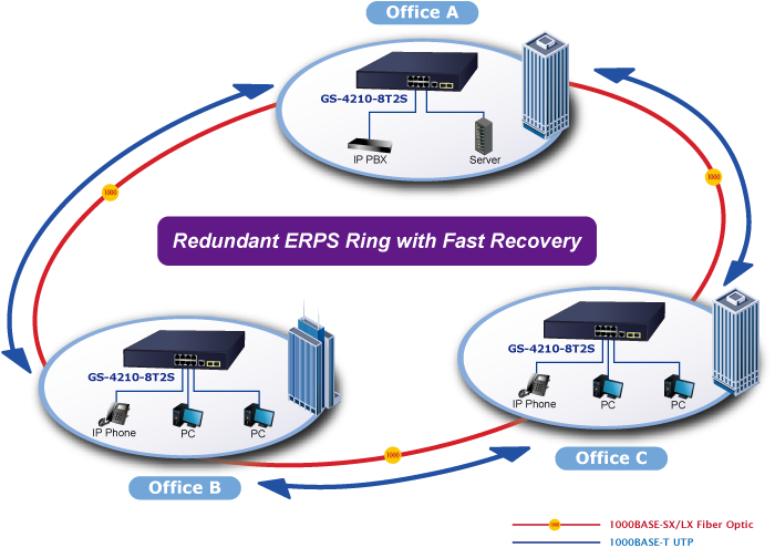 The GS-4210-8T2S supports redundant ring technology and features strong, rapid self-recovery capability to prevent interruptions and external intrusions. It incorporates advanced ITU-T G.8032 ERPS (Ethernet Ring Protection Switching) technology and Spanning Tree Protocol (802.1s MSTP) into customer’s network to enhance system reliability and uptime in various environments.