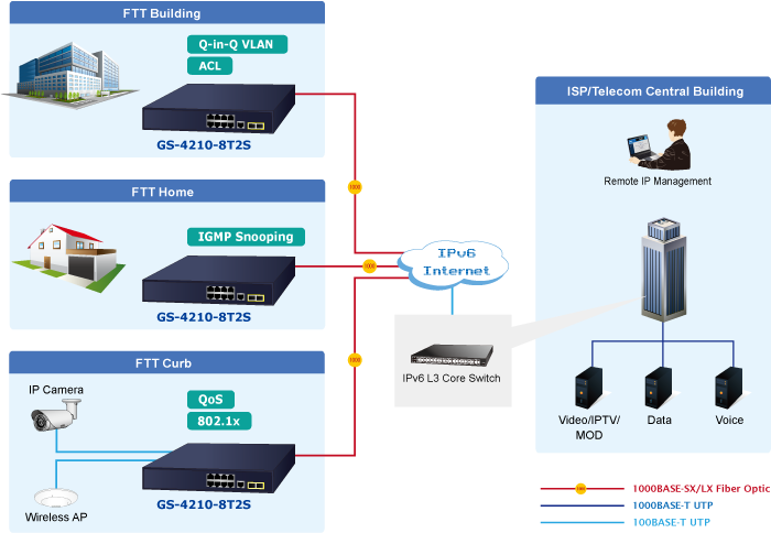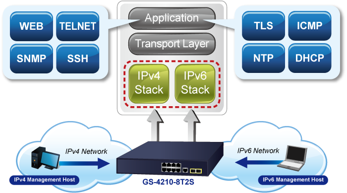 Supporting both IPv6 and IPv4 protocols, the GS-4210-8T2S helps the SMBs to step in the IPv6 era with the lowest investment as its network facilities need not be replaced or overhauled if the IPv6 FTTx edge network is set up.