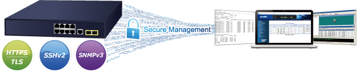 Moreover, the GS-4210-8T2S offers secure remote management by supporting SSHv2, TLSv1.2 and SNMP v3 connections which encrypt the packet content at each session.