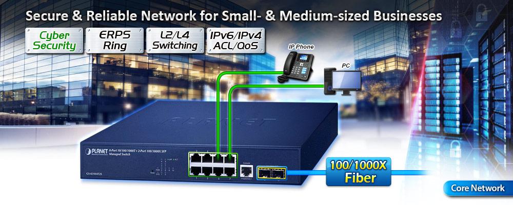 PLANET GS-4210-8T2S is an 8-Port Gigabit Managed Ethernet Switch with SFP interfaces specially designed to build a full Gigabit backbone to reliably transmit and forward data to remote network through fiber optic. It provides 8 10/100/1000BASE-T copper ports and 2 extra 100/1000BASE-X SFP fiber optic interfaces with built-in power system. Besides support for 20Gbps switch fabric to handle extremely large amounts of video, voice and important data in a secure topology, the GS-4210-8T2S provides user-friendly but advanced IPv6 / IPv4 management interfaces and abundant L2 / L4 switching functions. It is the best investment for businesses and SOHOs expanding or upgrading their network infrastructures.