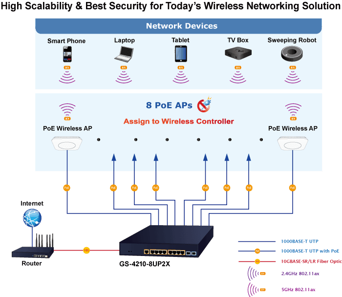 • applications_tab: <p><strong>ITU-T G.8032 ERPS with PoE IP Surveillance System for SMBs/Workgroups</strong><p>The GS-4210-8UP2X features strong rapid self-recovery capability to prevent interruptions and external intrusions. It incorporates <strong>ITU-T G.8032 ERPS (Ethernet Ring Protection Switching)</strong> technology into customer’s automation network to enhance system reliability and uptime. Applying the IEEE 802.3at Power over Ethernet standard, the GS-4210-8UP2X can directly connect with any IEEE 802.3at end nodes like PTZ (pan, tilt, zoom) network cameras and speed dome cameras. The GS-4210-8UP2X can easily build a power that can centrally control a wireless AP, IP camera and VoIP system for SMBs and workgroups in the enterprises with high availability network infrastructure.</p><p> </p><p style="text-align: center;"><img src="https://www.planet.com.sa/planet-storage/2026/03/GS-4210-8UP2X-21.png" alt="" width="700" height="608"></p><p> </p><p><strong>Gigabit 802.3bt PoE++ and PoE+ Network Deployment Solution</strong></p><p>PLANET GS-4210-8UP2X can easily build an 802.3bt PoE++ networking solution on the cybersecurity system for the enterprises. For instance, it can work with the POS system and thin client to perform comprehensive security protection for today’s businesses. The GS-4210-8UP2X and 802.3bt PoE++ Splitter-POE-173S, operate as a pair to provide the easiest way to power your Ethernet devices which need high power input. Receiving data and power from the GS-4210-8UP2X, the POE-173S separates digital data and power into three optional outputs (12V, 19V or 24V DC) to non-PoE devices such as laptops, Thin Client, POS System, PTZ, network cameras, PTZ speed dome, color touch-screen IP phones, multi-channel wireless LAN access points and other network devices at distance up to 100 meters.</p><p> </p><p style="text-align: center;"><img src="https://www.planet.com.sa/planet-storage/2026/03/GS-4210-8UP2X-3.png" alt="" width="700" height="494"></p></p>