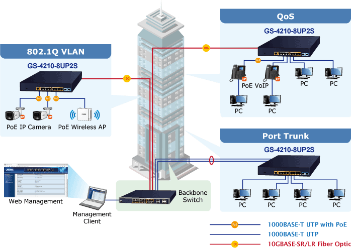The GS-4210-8UP2X features strong rapid self-recovery capability to prevent interruptions and external intrusions. It incorporates ITU-T G.8032 ERPS (Ethernet Ring Protection Switching) technology into customer’s automation network to enhance system reliability and uptime. Applying the IEEE 802.3at Power over Ethernet standard, the GS-4210-8UP2X can directly connect with any IEEE 802.3at end nodes like PTZ (pan, tilt, zoom) network cameras and speed dome cameras. The GS-4210-8UP2X can easily build a power that can centrally control a wireless AP, IP camera and VoIP system for SMBs and workgroups in the enterprises with high availability network infrastructure.