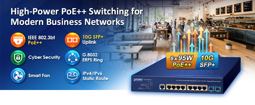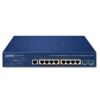 • key_features_tab: <p><strong>Physical Port</strong><ul> <li><strong>8 10/100/1000BASE-T ports with 95W 802.3bt PoE++</strong> injector function (Ports 1 to 8)</li> <li><strong>2 10GBASE-SR/LR SFP+ slots</strong>, backward compatible with 100/1G/2.5GBASE-X SFP transceivers (Ports XG1 to XG2)</li> <li>RJ45 to DB9 console interface for switch basic management and setup</li> </ul><p> </p><p><strong>Switching</strong></p><ul> <li>Hardware-based 10/100Mbps (half/full duplex), 1000Mbps (full duplex), auto-negotiation and auto MDI/MDI-X</li> <li>IEEE 802.3x flow control for full duplex operation and back pressure for half duplex operation</li> <li>16K MAC address table size</li> <li>12K jumbo frame</li> <li>Automatic address learning and address aging</li> </ul><p> </p><p><strong>Power over Ethernet</strong></p><ul> <li>Compliant with IEEE 802.3bt Power over Ethernet Plus Plus</li> <li>8 ports supporting IEEE 802.3bt PoE++ with each offering up to 95 watts (Ports 1-8)</li> <li>Total PoE power budget of 240 watts</li> <li>Automatic detection of powered devices (PD)</li> <li>Built-in circuit protection to prevent power interference between ports</li> <li>Remote power feeding up to 100 meters in standard mode and 250 meters in extend mode</li> <li>Advanced PoE management capabilities: <ul> <li>Total PoE power budget control</li> <li>Per port PoE function enable/disable</li> <li>PoE port power feeding priority</li> <li>Per PoE port power limitation</li> <li>Detection of PD classification</li> </ul> </li> <li>Intelligent PoE features <ul> <li>PD alive check</li> <li>PoE schedule</li> <li>Scheduled power recycling</li> </ul> </li> </ul><p> </p><p><strong>Layer 2 Features</strong></p><ul> <li>Supports VLAN <ul> <li>IEEE 802.1Q tagged VLAN</li> <li>Provider bridging (VLAN Q-in-Q, IEEE 802.1ad) support</li> <li>Protocol VLAN</li> <li>Private VLAN (Protected port)</li> <li>Management VLAN</li> <li>GVRP</li> </ul> </li> <li>Supports Spanning Tree Protocol <ul> <li>STP (Spanning Tree Protocol)</li> <li>RSTP (Rapid Spanning Tree Protocol)</li> <li>MSTP (Multiple Spanning Tree Protocol)</li> <li>STP BPDU Guard, BPDU Filtering and BPDU Forwarding</li> </ul> </li> <li>Supports Link Aggregation <ul> <li>IEEE 802.3ad Link Aggregation Control Protocol (LACP)</li> <li>Cisco ether-channel (static trunk)</li> <li>Maximum 8 trunk groups, up to 8 ports per trunk group</li> </ul> </li> <li>Supports port mirror (many-to-1)</li> <li>Loop protection to avoid broadcast loops</li> <li>Supports ERPS (Ethernet Ring Protection Switching)</li> <li>Link Layer Discovery Protocol (LLDP)</li> </ul><p> </p><p><strong>Quality of Service</strong></p><ul> <li>Ingress and egress rate limit per port bandwidth control</li> <li>Storm control support <ul> <li>Broadcast/Unknown unicast/Unknown multicast</li> </ul> </li> <li>Traffic classification <ul> <li>IEEE 802.1p CoS</li> <li>TOS/DSCP/IP precedence of IPv4/IPv6 packets</li> </ul> </li> <li>Strict priority and Weighted Round Robin (WRR) CoS policies</li> </ul><p> </p><p><strong>Multicast</strong></p><ul> <li>Supports IPv4 IGMP snooping v2 and v3</li> <li>Supports IPv6 MLD snooping v1, v2</li> <li>IGMP querier mode support</li> <li>IGMP snooping port filtering</li> <li>MLD snooping port filtering</li> </ul><p> </p><p><strong>Security</strong></p><ul> <li>Authentication <ul> <li>Built-in RADIUS client to cooperate with the RADIUS servers</li> <li>RADIUS/TACACS+ login user access authentication</li> <li>DHCP Option 82</li> </ul> </li> <li>Access control list <ul> <li>IPv4/IPv6 IP-based ACL</li> <li>IPv4/IPv6 IP-based ACE</li> <li>MAC-based ACL</li> <li>MAC-based ACE</li> </ul> </li> <li>MAC security <ul> <li>Static MAC</li> <li>MAC filtering</li> </ul> </li> <li>Port security for source MAC address entries filtering</li> <li>DHCP snooping to filter distrusted DHCP messages</li> <li>Dynamic ARP Inspection discards ARP packets with invalid MAC address to IP address binding</li> <li>IP source guard prevents IP spoofing attacks</li> <li>DoS attack prevention</li> </ul><p> </p><p><strong>Management</strong></p><ul> <li>IPv4 and IPv6 dual stack management</li> <li>Switch management interface <ul> <li>Web switch management</li> <li>Console and telnet command line interface</li> <li>SNMP v1 and v2c switch management</li> <li>SSHv2, TLSv1.3 and SNMP v3 secure access</li> </ul> </li> <li>SNMP Management <ul> <li>Four RMON groups (history, statistics, alarms and events)</li> <li>SNMP trap for interface link up and link down notification</li> </ul> </li> <li>User privilege levels control</li> <li>Built-in Trivial File Transfer Protocol (TFTP) client</li> <li>Static and DHCP for IP address assignment</li> <li>System maintenance <ul> <li>Firmware upload/download via HTTP/TFTP</li> <li>Configuration upload/download through HTTP/TFTP</li> <li>Dual images</li> <li>Hardware-based reset button for system reboot or reset to factory default</li> </ul> </li> <li>SNTP Network Time Protocol</li> <li>Network Diagnostic <ul> <li>SFP-DDM (digital diagnostic monitor)</li> <li>Cable diagnostics</li> <li>ICMPv4/ICMPv6 remote ping</li> </ul> </li> <li>Link Layer Discovery Protocol (LLDP) and LLDP-MED</li> <li>Event message logging to remote syslog server</li> <li>PLANET Smart Discovery Utility for deployment management</li> <li>PLANET NMS and CloudNMS for deployment management</li> </ul></p>