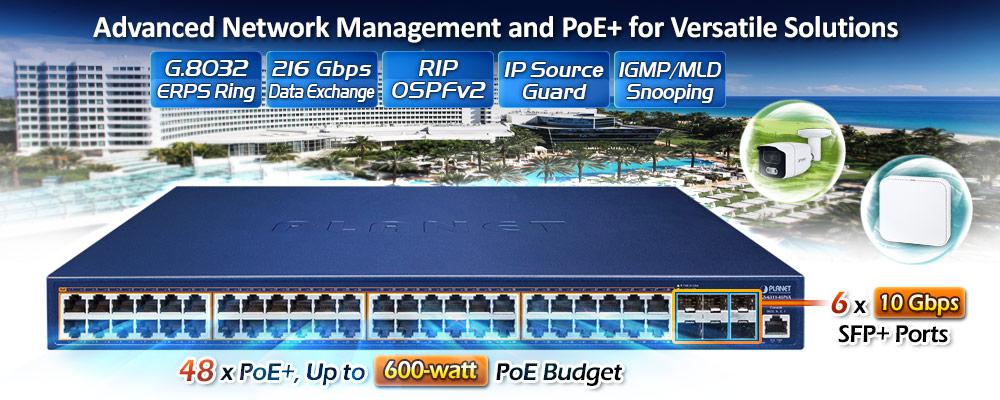• product_editor_4421_tab_content: <strong>Physical Ports</strong> <ul> <li>48 10/100/1000BASE-T with <strong>30W 802.3at PoE+</strong> injector function</li> <li><strong>6 10GBASE-SR/LR SFP+</strong> slots, compatible with 1000BASE-SX/LX/BX SFP</li> <li>RJ45 to DB9 console interface for switch basic management and setup</li> </ul>   <strong>IP Routing Features</strong> <ul> <li>IP routing protocol supports <strong>RIPv1/v2, OSPFv2</strong></li> <li>Routing interface provides per VLAN routing mode</li> <li>Supports route redistribution</li> </ul>   <strong>Multicast Routing Features</strong> <ul> <li>Supports IGMP v1/v2/v3 and MLD v1/v2</li> </ul>   <strong>Layer 2 Features</strong> <ul> <li>Complies with the IEEE 802.3, IEEE 802.3u, IEEE 802.3ab, IEEE 802.3z Gigabit Ethernet standard</li> <li>Prevents packet loss flow control <ul> <li>IEEE 802.3x pause frame flow control in full-duplex mode</li> <li>Back pressure flow control in half-duplex mode</li> </ul> </li> <li>High performance Store-and-Forward architecture, broadcast storm control, port loopback detection</li> <li>32K MAC address table, automatic source address learning and aging</li> <li>Supports VLAN <ul> <li>IEEE 802.1Q tag-based VLAN</li> <li>GVRP for dynamic VLAN management</li> <li>Provider Bridging (VLAN Q-in-Q, IEEE 802.1ad) supported</li> <li>Private VLAN Edge (PVE) supported</li> <li>GVRP protocol for Management VLAN</li> <li>Protocol-based VLAN</li> <li>MAC-based VLAN</li> <li>IP subnet VLAN</li> </ul> </li> <li>Supports Link Aggregation <ul> <li>Maximum 64 trunk groups, up to 8 ports per trunk group</li> <li>IEEE 802.3ad LACP (Link Aggregation Control Protocol)</li> <li>Cisco ether-channel (static trunk)</li> </ul> </li> <li>Supports Spanning Tree Protocol <ul> <li>STP, IEEE 802.1D (Classic Spanning Tree Protocol)</li> <li>RSTP, IEEE 802.1w (Rapid Spanning Tree Protocol)</li> <li>MSTP, IEEE 802.1s (Multiple Spanning Tree Protocol, spanning tree by VLAN)</li> <li>Supports BPDU & root guard</li> </ul> </li> <li>Port mirroring to monitor the incoming or outgoing traffic on a particular port (many to many)</li> <li>Provides port mirror (many-to-1)</li> <li>Supports G.8032 ERPS (Ethernet Ring Protection Switching)</li> </ul>   <strong>Quality of Service</strong> <ul> <li>8 priority queues on all switch ports</li> <li>Support for strict priority and WRR (Weighted Round Robin) CoS policies</li> <li>Traffic classification <ul> <li>IEEE 802.1p CoS/ToS</li> <li>IPv4/IPv6 DSCP</li> <li>Port-based WRR</li> </ul> </li> <li>Strict priority and WRR CoS policies</li> </ul>   <strong>Multicast</strong> <ul> <li>Supports IPv4 IGMP snooping v1, v2 and v3</li> <li>Supports IPv6 MLD v1 and v2 snooping</li> <li>Querier mode support</li> <li>Supports Multicast VLAN Register (MVR)</li> </ul>   <strong>Security</strong> <ul> <li>IEEE 802.1x port-based network access authentication</li> <li>MAC-based network access authentication</li> <li>Built-in RADIUS client to cooperate with the RADIUS servers for IPv4 and IPv6</li> <li>TACACS+ login users access authentication</li> <li>IP-based Access Control List (ACL)</li> <li>MAC-based Access Control List</li> <li>Supports DHCP snooping</li> <li>Supports ARP inspection</li> <li><strong>IP Source Guard</strong> prevents IP spoofing attacks</li> <li><strong>Dynamic ARP Inspection</strong> discards ARP packets with invalid MAC address to IP address binding</li> </ul>   <strong>Management</strong> <ul> <li>Management IP for IPv4 and IPv6</li> <li>Switch Management Interface <ul> <li>Console/Telnet Command Line Interface</li> <li>Web switch management</li> <li>SNMP v1, v2c, and v3 switch management</li> <li>SSHv2/TLSv1.2 secure access</li> </ul> </li> <li>BOOTP and DHCP for IP address assignment</li> <li>Firmware upload/download via TFTP or HTTP Protocol for IPv4 and IPv6</li> <li>SNTP (Simple Network Time Protocol) for IPv4 and IPv6</li> <li>User privilege levels control</li> <li>Syslog server for IPv4 and IPv6</li> <li>Supports DDM</li> <li>Four RMON groups 1, 2, 3, 9 (history, statistics, alarms and events)</li> <li>Supports sFlow</li> <li>Supports ULDP</li> <li>Supports ULPP (Uplink Protection Protocol)</li> <li>Supports ULSM (Uplink State Monitor protocol)</li> <li>Supports LLDP/LLDP MED</li> <li>Supports DHCP Option82/43/60/61/67</li> <li>Supports ping, trace route function for IPv4 and IPv6</li> <li>PLANET Smart Discovery Utility for deployment management</li> </ul>   <strong>Power over Ethernet </strong> <ul> <li>Complies with IEEE 802.3at/af Power over Ethernet Plus (GS-6311-48P6X)</li> <li>Up to 48 ports of IEEE 802.3af/802.3at devices powered (GS-6311-48P6X)</li> <li>Supports PoE power up to 30 watts for each PoE port (GS-6311-48P6X)</li> <li>110VAC supports maximum 500-watt PoE budget (GS-6311-48P6X)</li> <li>220VAC supports maximum 600-watt PoE budget (GS-6311-48P6X)</li> <li>Auto detects powered device (PD)</li> <li>Circuit protection prevents power interference between ports</li> <li>Remote power feeding up to 100 meters</li> <li>PoE management <ul> <li>Total PoE power budget control</li> <li>Per port PoE function enable/disable</li> <li>PoE port power feeding priority</li> <li>Per PoE port power limitation</li> <li>PD classification detection</li> </ul> </li> <li>Intelligent PoE features <ul> <li>PD alive check</li> <li>PoE schedule</li> </ul> </li> </ul>