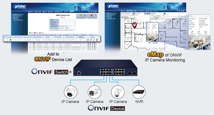 PLANET has newly developed an awesome feature — ONVIF Support — which is specifically designed for co-operating with Video IP Surveillances. From the GS-6320-24UP2T2XV GUI, clients just need one click to search and show all of the ONVIF devices via network application. In addition, clients can upload floor images to a switch and it allows you to deploy any surveillance devices for easier inspection and planning. Moreover, clients can get real-time surveillance’s information and online/offline status, and also allows PoE reboot control from GUI.