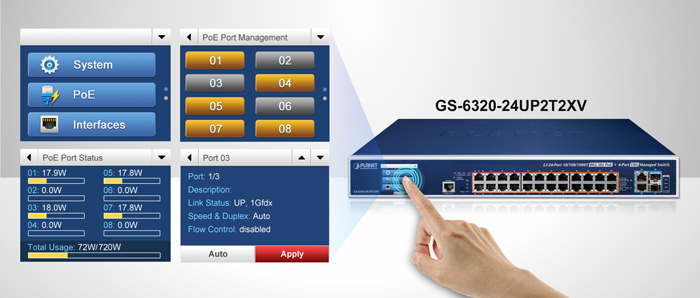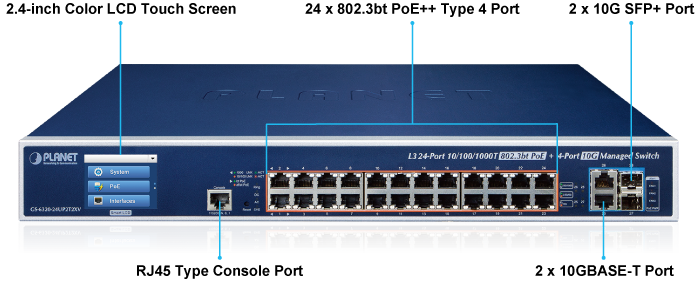 PLANET GS-6320-24UP2T2XV is a cost-optimized, 1.25 U, Gigabit 802.3bt PoE Managed Switch with LCD Touch Screen featuring PLANET intelligent PoE functions to improve the availability of critical business applications. It provides IPv6/IPv4 dual stack management and built-in L2+/L4 Gigabit switching engine along with 24 10/100/1000BASE-T 802.3bt PoE++ ports, 2 10GBASE-T RJ45 ports and 2 additional 10Gigabit SFP+ ports. With a total power budget of up to 720 watts for different kinds of PoE applications, the GS-6320-24UP2T2XV provides a quick, safe and cost-effective 802.3bt PoE network solution for small businesses and enterprises