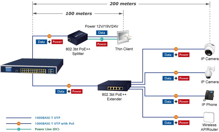 The GS-6320-24UP2T2XV supports the 802.3bt standard, supplying up to 95 watts per port for increased requirements of devices. It can offer more PoE applications, such as: