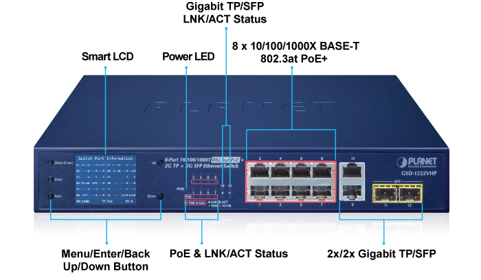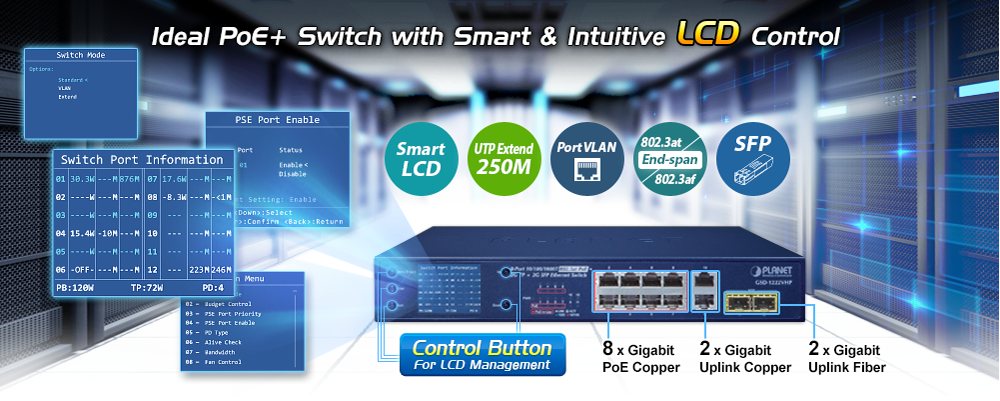 PLANET GSD-1222VHP is an ideal Plug and Watch Power over Ethernet solution which provides quick installation, real-time PoE work status monitoring and immediate troubleshooting through its unique LCD display to improve work efficiency and quality without any PC or software required.