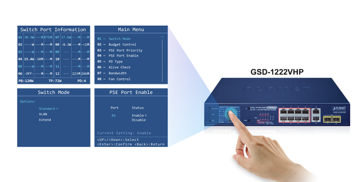 PLANET GSD-1222VHP provides an intuitive color panel on its front panel that facilitates the Ethernet management and PoE PD management. They greatly promote management efficiency in large-scale networks for enterprises, hotels, shopping malls, government buildings and other public areas, and feature the following special management and status functions: