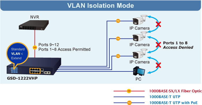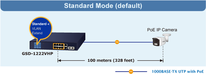 PLANET GSD-1222VHP provides Standard, VLAN and Extend operation modes. The GSD-1222VHP operates as a normal IEEE 802.3af/at PoE Switch in the Standard operation mode. The VLAN operation mode features the port-based VLAN function that can help to prevent the IP camera’s multicast or broadcast storm from influencing each other.
