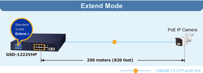 In the Extend operation mode, the GSD-1222VHP operates on a per-port basis at 10Mbps duplex operation but can support 30-watt PoE power output over a distance of up to 250 meters overcoming the 100m limit on Ethernet UTP cable. With this brand-new feature, the GSD-1222VHP provides an additional solution for 802.3at/af PoE distance extension, thus saving the cost of Ethernet cable installation. Its VLAN isolation function isolates ports so as to prevent broadcast storm and defend DHCP spoofing in the Extend operation mode.