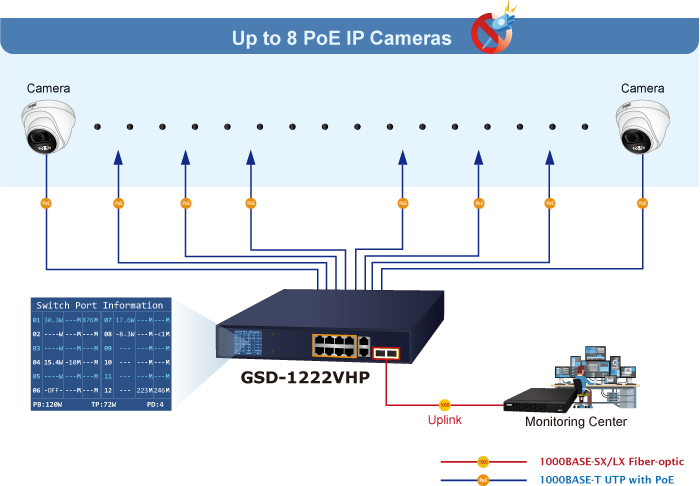 • product_editor_4418_tab_content: <strong>Perfectly-integrated Solution for PoE IP Camera and NVR System</strong> With its 24Gbps high-performance switch architecture and 120-watt PoE power budget, the recorded video files from the 8 PoE IP cameras powered by the GSD-1222VHP are saved in the 8-channel NVR systems or surveillance software in the monitoring center for possible backup references. <img style="display: block; margin-left: auto; margin-right: auto;" src="https://www.planet.com.sa/planet-storage/2025/01/GSD-1222VHPv2-6.png" alt="" width="700" height="486" />   <strong>Ideal PoE Switch for All Enterprises</strong> Providing eight 802.3at PoE+ in-line power interfaces, the GSD-1222VHP can easily build a power that centrally controls IP phone system, IP camera system and wireless AP group for enterprises. Cameras can be installed around the corner in the company or campus for surveillance demands. Without the need for power sockets, the GSD-1222VHP makes the installation of cameras easier and more efficient.   <img style="display: block; margin-left: auto; margin-right: auto;" src="https://www.planet.com.sa/planet-storage/2025/01/GSD-1222VHPv2-7.png" alt="" width="700" height="438" />