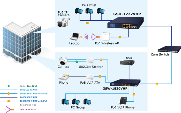 • applications_tab: <p><strong>Perfectly-integrated Solution for PoE IP Camera and NVR System</strong></p><p>With its 24Gbps high-performance switch architecture and 120-watt PoE power budget, the recorded video files from the 8 PoE IP cameras powered by the GSD-1222VHP are saved in the 8-channel NVR systems or surveillance software in the monitoring center for possible backup references. <img style="display: block; margin-left: auto; margin-right: auto;" src="https://www.planet.com.sa/planet-storage/2025/01/GSD-1222VHPv2-6.png" alt="" width="700" height="486"></p><p> </p><p><strong>Ideal PoE Switch for All Enterprises</strong></p><p>Providing eight 802.3at PoE+ in-line power interfaces, the GSD-1222VHP can easily build a power that centrally controls IP phone system, IP camera system and wireless AP group for enterprises. Cameras can be installed around the corner in the company or campus for surveillance demands. Without the need for power sockets, the GSD-1222VHP makes the installation of cameras easier and more efficient.</p><p> </p><p><img style="display: block; margin-left: auto; margin-right: auto;" src="https://www.planet.com.sa/planet-storage/2025/01/GSD-1222VHPv2-7.png" alt="" width="700" height="438"></p>
